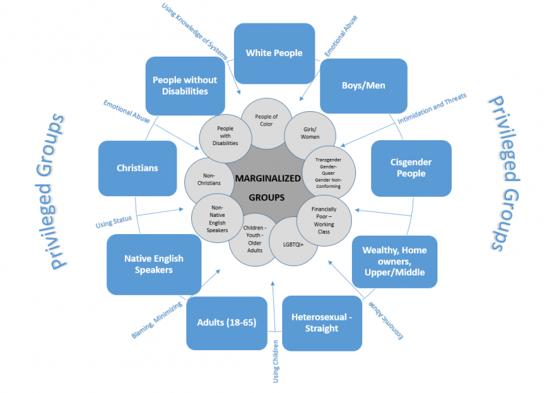 DEI administrators discriminate against those they label oppressors and in favor of those they label oppressed. Universities that used to accept people on the basis of merit now accept people on the basis of their identity. Here is a diagram that is used in DEI courses that shows the identities that are defined as oppressed in the center. Non-christians and people of color are two of the groups as defined as oppressed. Non-christians include Muslims but don't include Jews in practice. Jews are white oppressors according to D.E.I people.