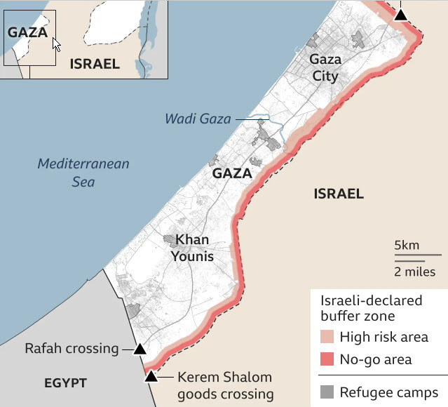 Many people talk about what they were told is going on in Gaza without knowing anything about it. Gaza is a region at the south western end of Israel. It is 25 miles long, by 4 to 8 miles wide. To put that in perspective the smallest state in the USA, Rhode Island is 48 miles long and 37 miles wide.