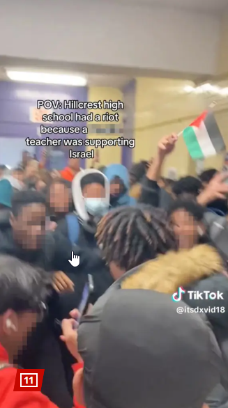 Students at Hillcrest high school (in Jamaica Queens) found out that one of their teachers had attended a pro-Israel rally. Hundreds of kids flooded into hallways in protest, running amok, chanting, jumping, shouting, vandalizing the school and waving Palestinian flags or banners. Many tried to barge into the teacher’s classroom despite school staffers blocking their entry. “Everyone was yelling ‘Free Palestine!’” a senior said. “Everyone was screaming ‘(The teacher) needs to go!’” a ninth-grader said... They found where she lives — her address, her phone number, her family and everything — her personal information,” a senior said.
